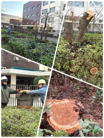 本日も正門横の桜の木の伐採工事が行われました。寂しいですが、安全のため仕方ありません。長い間、ありがとう!