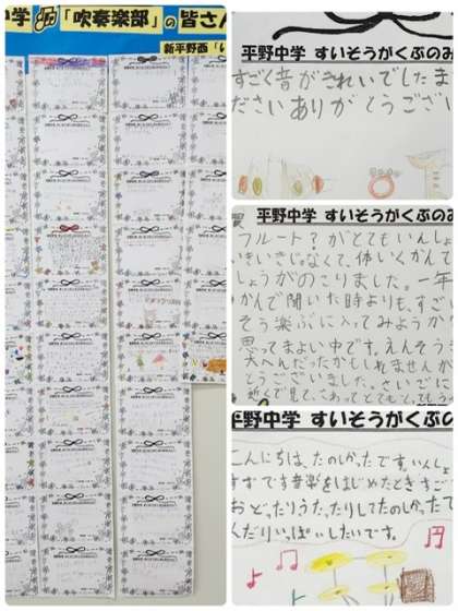 昨年末に、吹奏楽部が新平野西小学校いきいき活動のクリスマス会に参加し、演奏を披露したことで、参加した小学生からの御礼のお手紙が届きました。