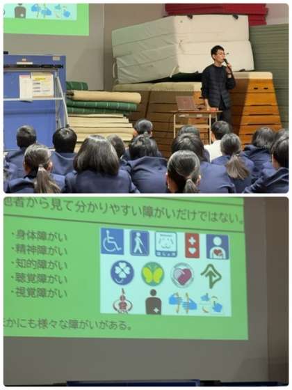 全盲の視覚障がいの中学生が、自力で通学していくビデオを見て、障がいやさまざまな違いのある人が、安心して暮らせる社会になるには、私達はどのように考え、また行動すれば良いかを考える機会としました。