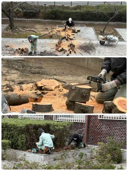 1月に正門横の桜がクビアカツヤカミキリの食害にあい、今後倒木の危険があることから伐採されましたが、校内の桜も既に食害が進んでいる桜が1本あり、他の桜を守るために剪定をしてもらいました。