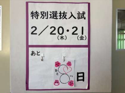 公立特別選抜入試間近 公開日 2025/02/13 更新日 2025/02/13 お知らせ 3年生の私立高校入試の合格発表も終わり、昨日から公立一般入試の懇談会を実施しています。その為、45分の短縮で3年生は午前中で給食後は下校となります。 明日からは一般入試に先立ち、公立特別選抜入試の出願が始まります。今年より、オンラインによる出願の為。受験校に持参する事はありません。