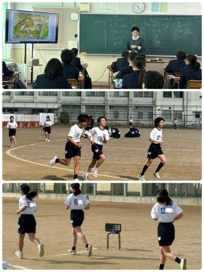 授業風景 公開日 2025/02/20 更新日 2025/02/20 出来事 ●1年生の授業風景 社会では歴史的分野で、第3章「中世の日本」に入ります。導入で武士の館を見て気づく事を考えていました。 体育では、男女共に持久走をしています。12分間走で、前回の記録から自分で走る距離(2,000mや3,000mなど)を目標設定して、到達を目指します。