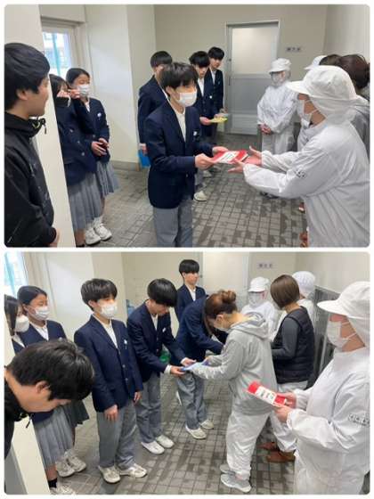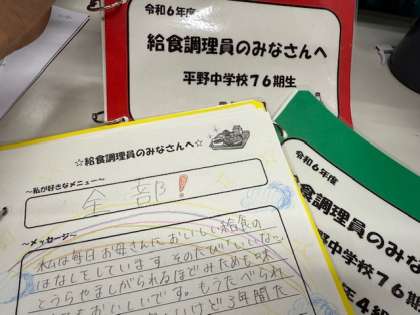 給食調理員さんへ 公開日 2025/03/05 更新日 2025/03/05 出来事 3月4日(火) 放課後、卒業式を来週に控えた3年生が、給食調理員さんに給食のお礼状を届けに行きました。 好きなメニューと感謝の気持ちを書いたメッセージに、喜んでいただけました。