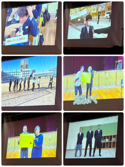 続いて、3年生へのビデオメッセージが紹介されました。ビデオメッセージ1・2年の生徒会・専門委員会からのメッセージに始まり、1・2年生の各学級、部活動、お世話になった教職員などからのお祝いの言葉や生徒会の3年生への突撃インタビューなど盛りだくさんで、素晴らしい送る会となりました。