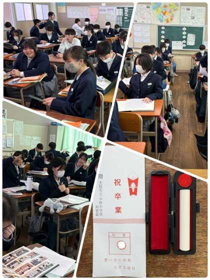●午後からは教室で卒業アルバム、卒業文集、同窓会からの記念品などを受け取ると、アルバムに見入っていました。