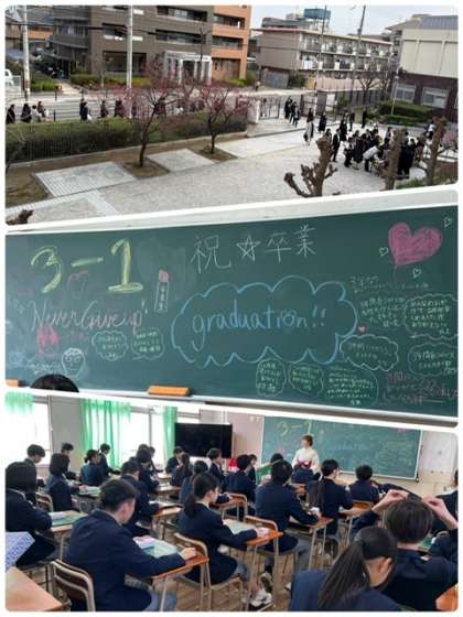 卒業を惜しむかのように、朝から生徒は教室の黒板に絵を描いたり、卒業の歌練習し、式への意気込みが感じられました。