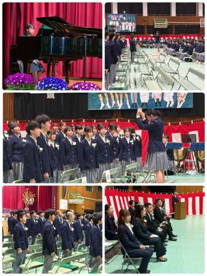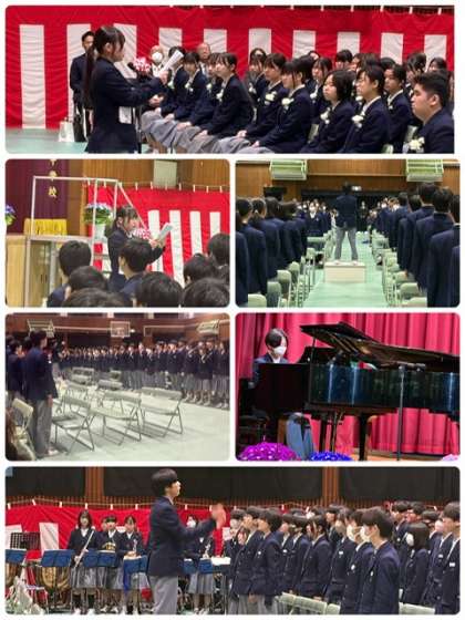 在校生代表送辞では卒業生への感謝と2年生の次年度への決意が述べられ、2年生全員で送別の歌「その先へ」を心を込めて合唱しました。
