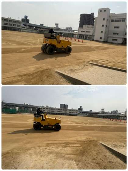 ●今日で長寿命化工事の第一期工事(2号館)も終了となり、資材置場となっていたグランドの一部の整備が行われています。