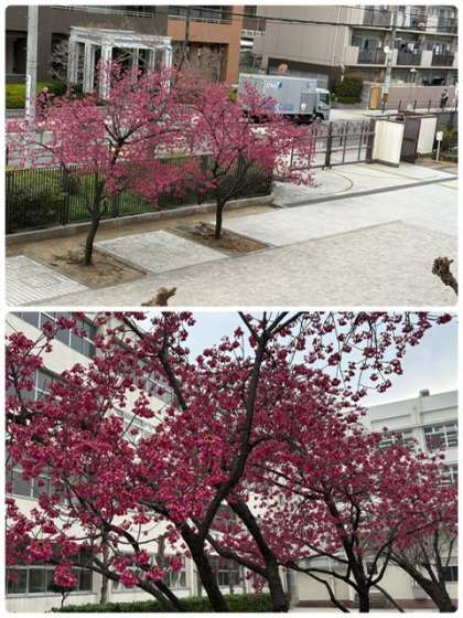 正門付近の桜も、寒緋桜でしょうか2本の早咲きの桜の木が紅い花を咲かせてくれています。