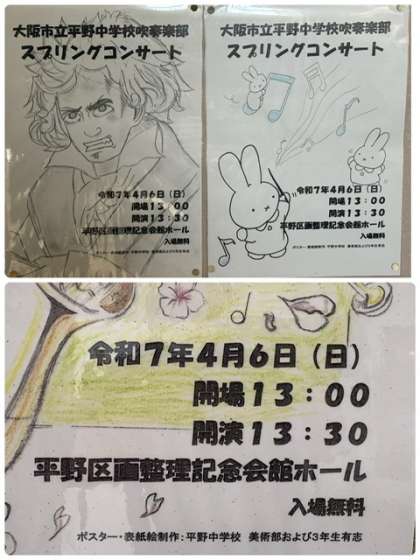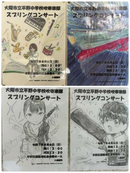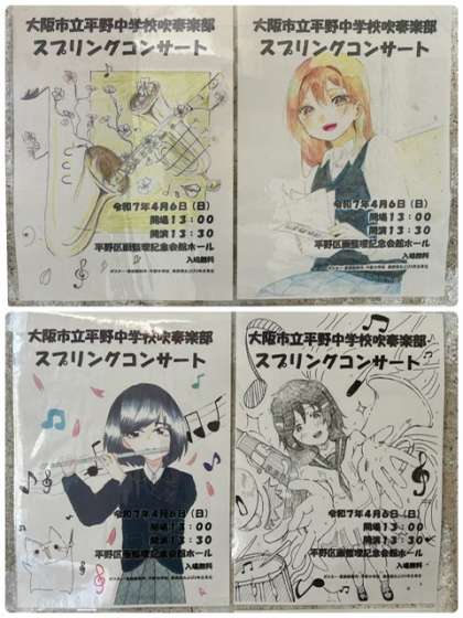 美術部と昨年の3年生有志が吹奏楽部のコンサートのポスターをたくさん作成してくれました。