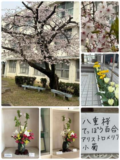 正門側の桜は体育館横の八重桜以外はすでに散っている状況ですが、4号館裏の1本桜はまだきれいに咲いています。
