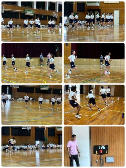 新体力テストのシャトルランを男女ともクラスを2グループに分かれて実施しました。