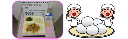 今日の給食では、冷凍加工された白玉だんごをスチームコンベクションオーブンで蒸し、砂糖、しょうゆ、水を合わせて煮て、でんぷんでとろみをつけたたれをからめたものに、きな粉を添えています。