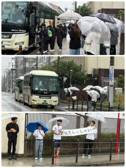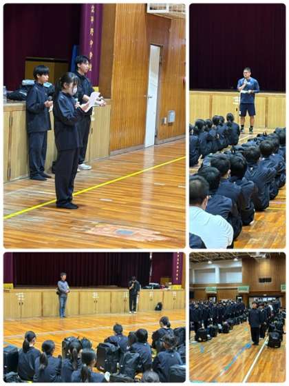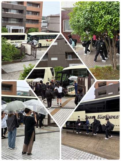 一泊移住 公開日 2025/06/03 更新日 2025/06/03 出来事 ●朝の出発式 体育館で校長先生のあと生徒代表のあいさつ、写真屋さんの紹介、学年主任からの諸注意が行われました。 ●雨の中、3台のバスに乗車し予定通り出発しました。