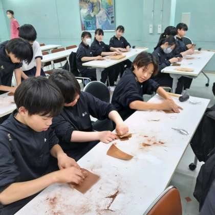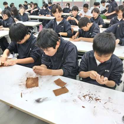 紙ヤスリでみんな一生懸命、木の皮を削っています。