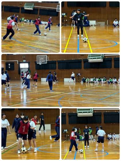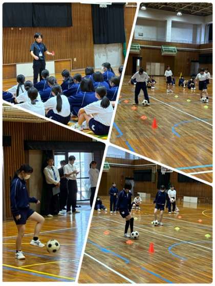 3年生の女子体育で、サッカーの授業をしています。大学の先生も参観に来る中、リフティング、ドリブル、対面パス、ミニゲームなどを時間内に終え、終了後には安堵の様子がうかがえました。