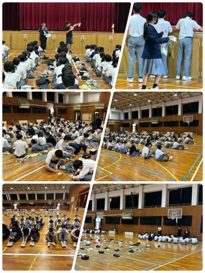 明日は校外学習で大阪・関西万博に出発します。体育館で一人ずつIDカードが配布され、集合体系などの確認や諸注意が行われました。