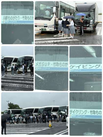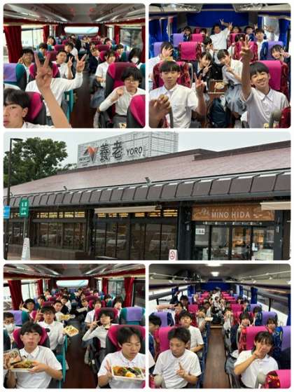 修学旅行 3 公開日 2025/06/10 更新日 2025/06/10 出来事 渋滞遅れと雨天のため、予定(川島PA)を変更して、養老SAでバス内で昼食としました。 午後の体験活動別のバスに乗り換え、12:50に養老SAを出発しました。