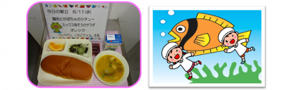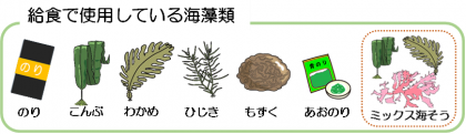今日の給食では、キャベツときゅうりにミックス海藻を加えて、砂糖、塩、酢、しょうゆを合わせてつくったドレッシングをかけてサラダにしています。ミックス海藻には、わかめ、茎わかめ、昆布、赤とさかのりが使われています。