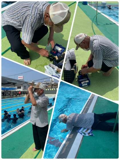 薬剤師さんがプールの水質検査に来ていただきました。入水前と入水中の残留塩素など調べてもらいました。