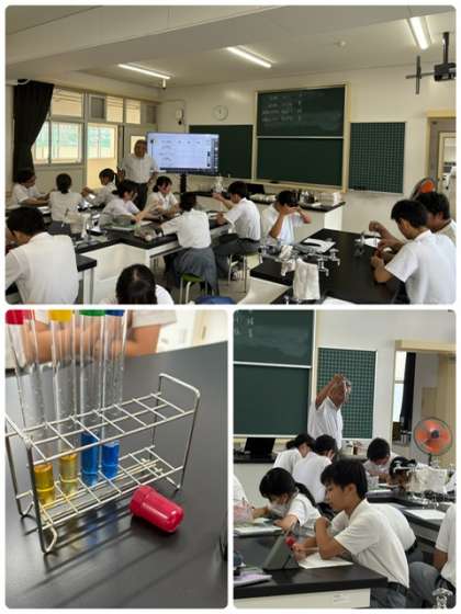 3年生理科 公開日 2025/07/09 更新日 2025/07/09 出来事 3年生理科 酸性やアルカリ性の水溶液に共通する性質について調べています。 BTB溶液、フェノールフタレイン溶液を加えた時の色の変化、PH試験紙につけた時の色など実験しています。