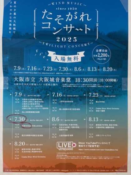 7月から大阪野外音楽堂で毎水曜日に「たそがれコンサート」が開催されています。