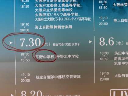 本日はその「たそがれコンサート」の第1部(18:30〜18:50)に平野中学校と平野北中学校の吹奏楽部が合同で出場します。
