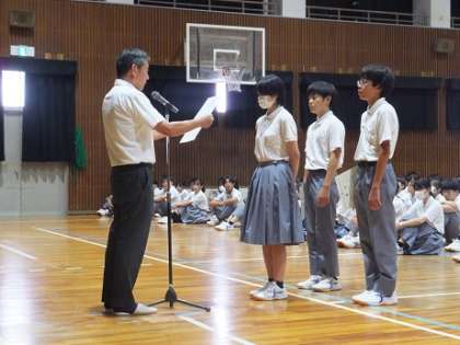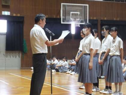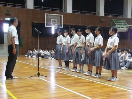 二学期の始業式が体育館で行われ、夏休み中の部活動の表彰が披露されました。