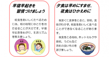 毎日の生活リズムを整えるためには、朝食が有効であるとよく言われています。また朝食をおいしく食べるためには、生活リズムを整えておくことが必要とも言われています。どちらが先なのかと迷いそうですが、朝食をとること自体も生活リズムの一部ですので、1日の生活全体を考える中で、朝食をしっかりと位置づけて習慣づけることが、健康的な生活を送るために必要であると思われます。