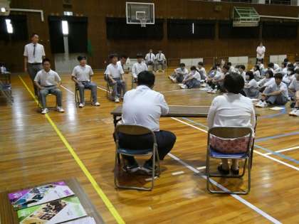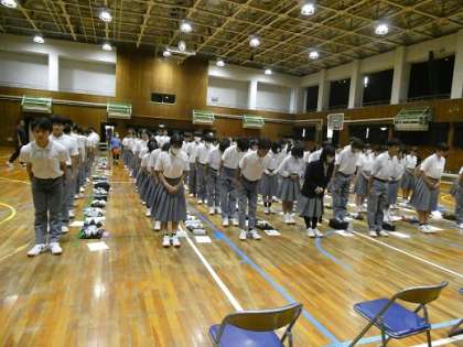 3年 面接・マナー講座 2 公開日 2025/09/05 更新日 2025/09/05 出来事 服装・頭髪などの身だしなみや「先言後礼」の挨拶、着席の姿勢から質疑の注意など、高校生のお手本や中学生の実践まで、楽しくまた、有意義な時間となりました。 忙しい中、来ていただき本当にありがとうございました。