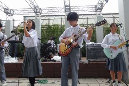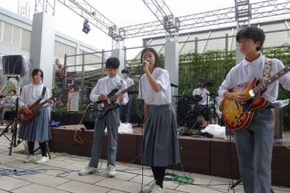 軽音楽部 あべのハルカスで演奏! 公開日 2025/10/21 更新日 2025/10/21 出来事 10月18日(土) あべのハルカス ウイング館10F 屋上ステージで本校軽音楽部のバンドが出場しました。 ●1年生バンドが、 「ハルノヒ」あいみょん 「YELL」いきものがかり ●2年生バンドが、 「ストロー」aiko を演奏しました。1年生はデビュー戦でしたので、緊張していましたが、100名を超える観客の前で堂々演奏できたと思います!