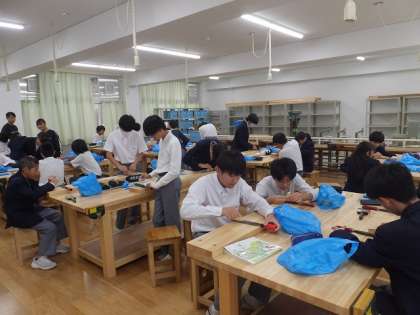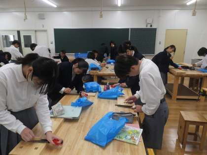 のこぎりで切った木の断面を、やすりで削り平らにしていました。