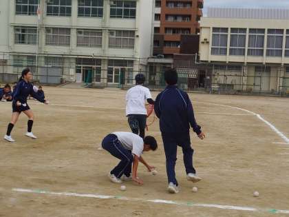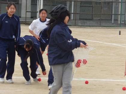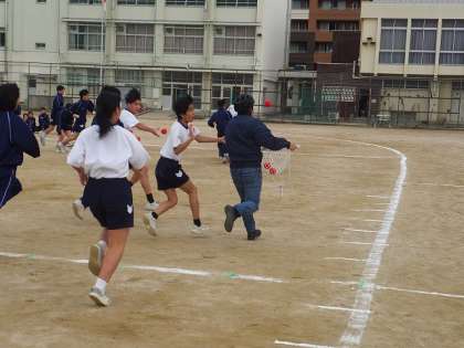 生徒持っている玉をかごに入れられないように、先生は逃げ回っています。