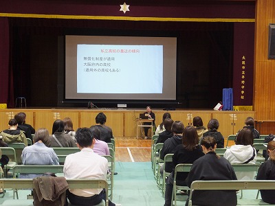 進路保護者説明会 公開日 2025/11/08 更新日 2025/11/08 出来事 11月6日(木) 本日放課後、3年生の保護者を対象に進路説明会を実施しました。 学年主任・学校長あいさつの後、進路指導主事から進路の手引きを使用し、入試制度や今後の予定、保護者の方へのお願いなどについて説明が行われました。