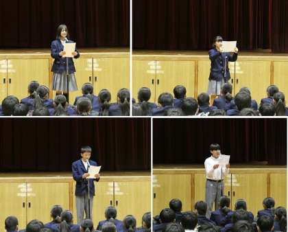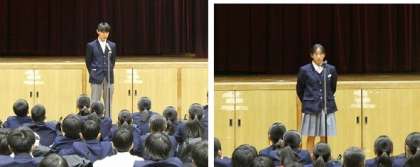 最初に部活動担当の先生より、部活総会の意義について説明があり、続いて3年生が引退後の各部の新部長(キャプテン)から部活動の目標などについて、決意表明が行われました。