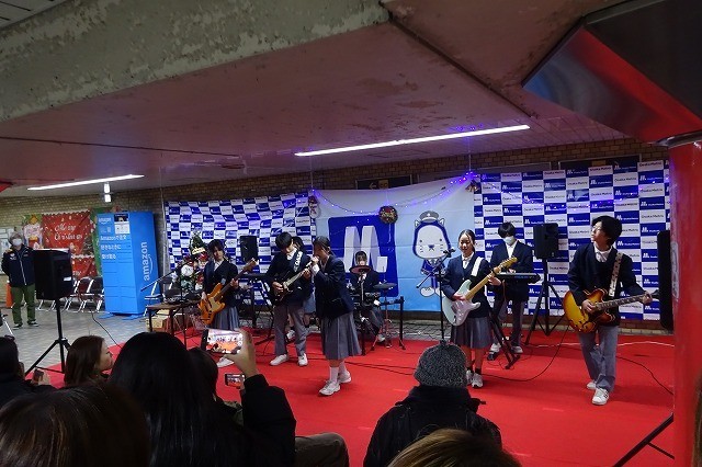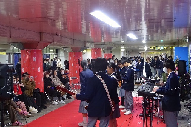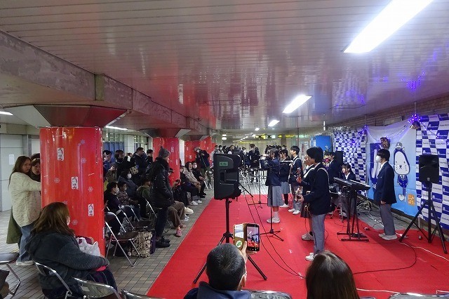 「大阪メトロ平野駅 ミュージックステーション」 公開日 2025/12/16 更新日 2025/12/16 出来事 12月13日(土)大阪メトロ平野駅で、吹奏楽部・軽音楽部がイベント出演しました!軽音楽部は、今回は1年生が「ハルノヒ(あいみょん)」「ロックンロール(くるり)」「イケナイ太陽(ORANGE RANGE)」の3曲を演奏し、会場を盛り上げました! +1