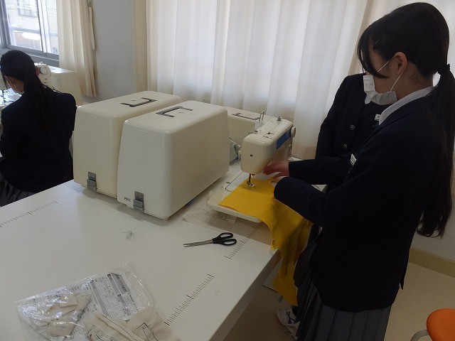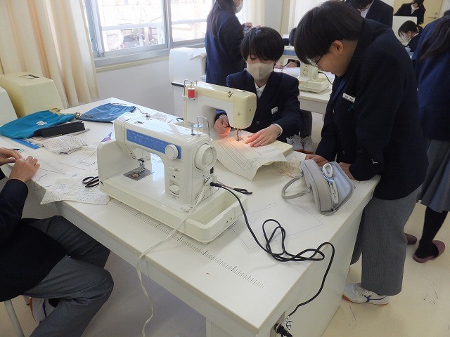 1年生が家庭科の被服実習をしています。ミシンと手縫いで 直線→曲線→角 の練習をしていました。