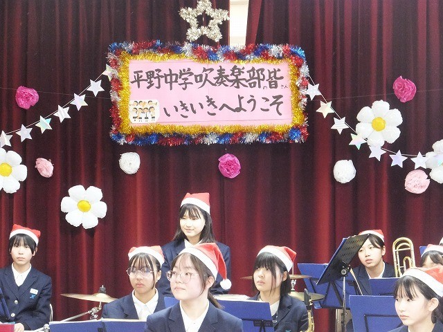 吹奏楽部が、新平野小学校のいきいき活動主催のクリスマス会に参加し、演奏を披露しクリスマス会を盛り上げてくれました。
