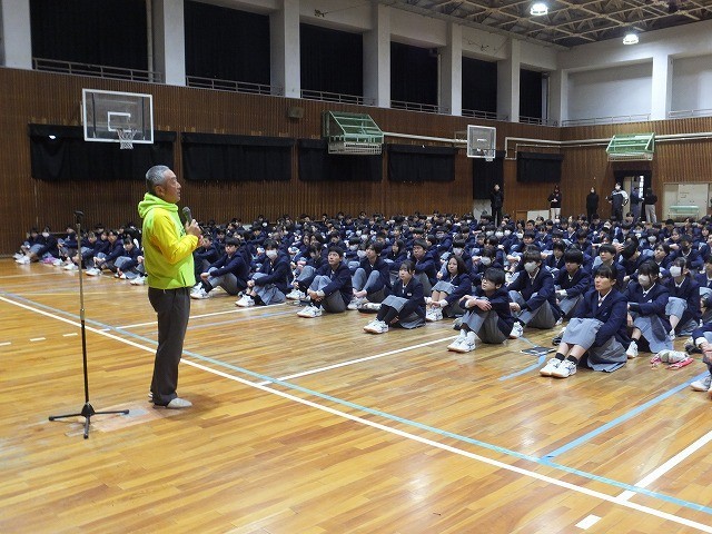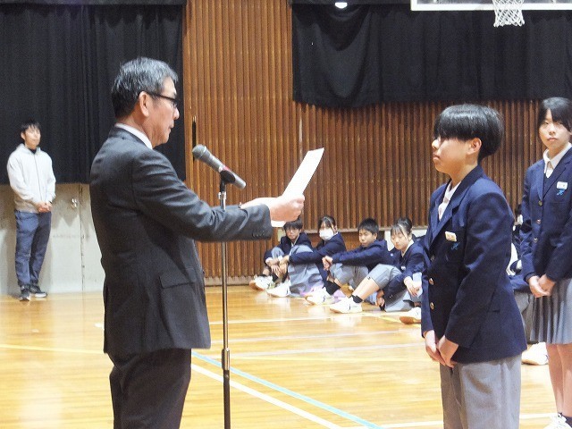 始業式では、吹奏楽部(大阪府アンサンブルコンテスト 地区別大会 管楽八重奏 銀賞)と男子バレーボール部(東総カップ)の表彰が披露されました。