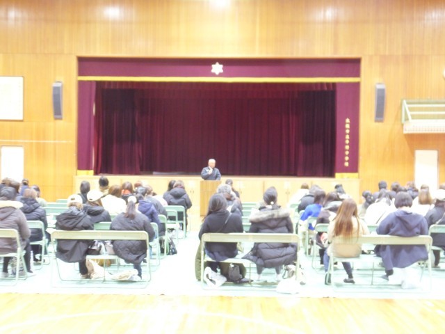 学校長あいさつ・生活指導部から服装・持ち物などの説明、教務から入学までの日程、事務室からは徴収金について、栄養教諭からは給食についてお話がありました。