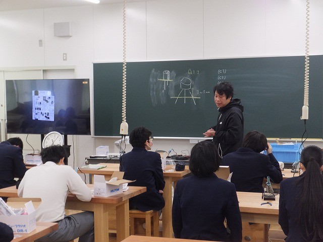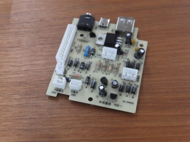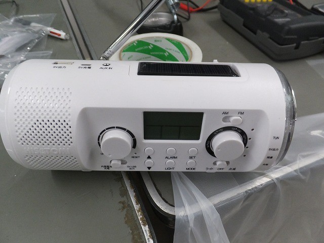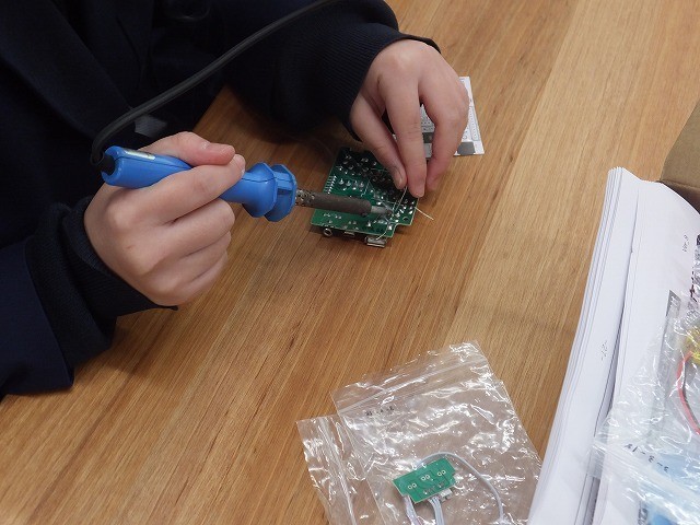 発電機付きラジオの製作で、はんだごてを使用し、電子部品を基盤にはんだ付けしています。