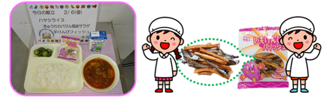 「いもけんぴフィッシュ」は、カタクチイワシの稚魚の煮干しを塩、砂糖、水あめなどで味付けしたものと、さつま芋を油で揚げて、煮詰めた砂糖をからめて味付けした芋けんぴを合わせた製品です。いわしとさつま芋はどちらも国産のものを使用しています。不足しがちなカルシウムの摂取量増加と、噛み応えのある食品で咀嚼力を強化することを目標として学校給食用に考案されました。