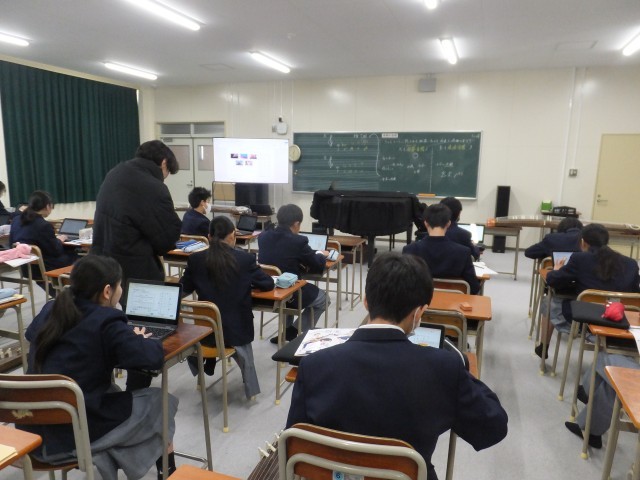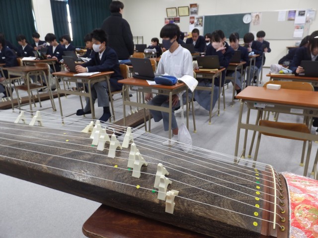 日本の伝統楽器である筝の学習をし、実際に筝で「さくらさくら」を演奏するだけでなく、タブレットの創作ツールを使用し、「さくらさくら」