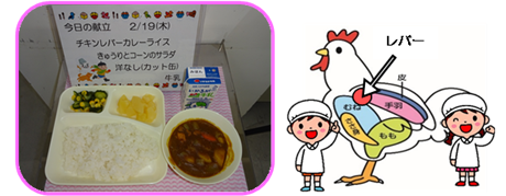 肉や魚などの動物性食品に含まれる鉄は、体内に吸収されやすい形となっており、特にレバーには多くの鉄分が含まれていますが、苦手に感じる方も多いため、食べやすくするため、カレーライスに少量加えています。今回使用しているのは、一人当たり、わずか6.5gですが、これだけで0.6mgの鉄分を含んでいます。