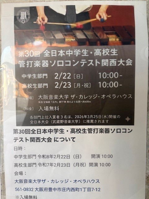 2月22日(日) 第30回 全日本中学生・高校生 管打楽器ソロコンテスト関西大会が大阪音楽大学 ザ・カレッジ・オペラハウスで開催されました。