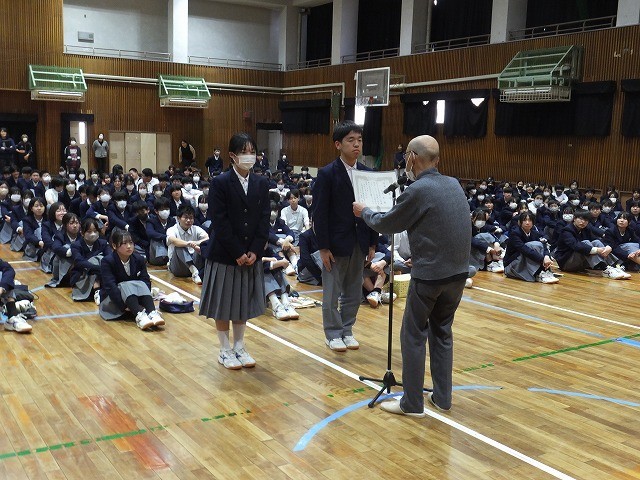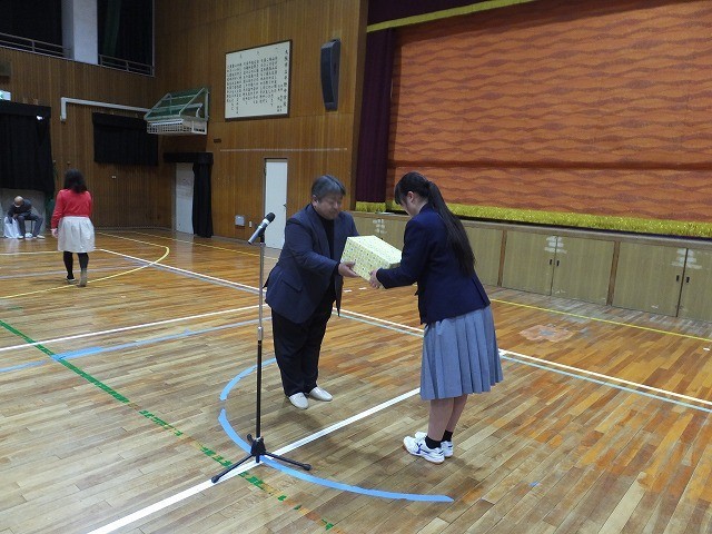 まず最初に新平野西地域の青少年健全育成会から3年生全員に記念品が贈呈され、続いて平野西青少年健全育成会からは皆勤賞の生徒への表彰状と記念品が贈呈され、それぞれお二方から励ましのお言葉をいただきました。