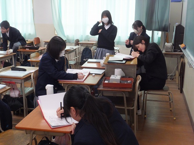 ●午後からは教室で卒業アルバム、卒業文集、同窓会からの記念品などを受け取ると、アルバムに見入っていました。