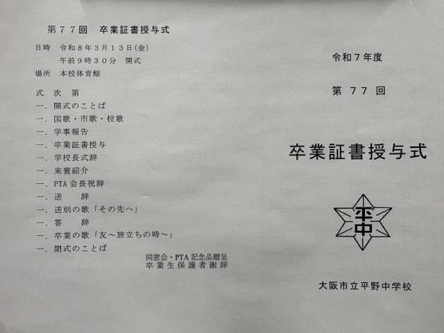 卒業式次第 公開日 2026/03/12 更新日 2026/03/12 お知らせ 明日の卒業式次第です。再度の連絡になりますが、正門の開門は8:55、開式は9:30です。保護者の方は9:15までにご入場ください。9:25には卒業生が入場します。