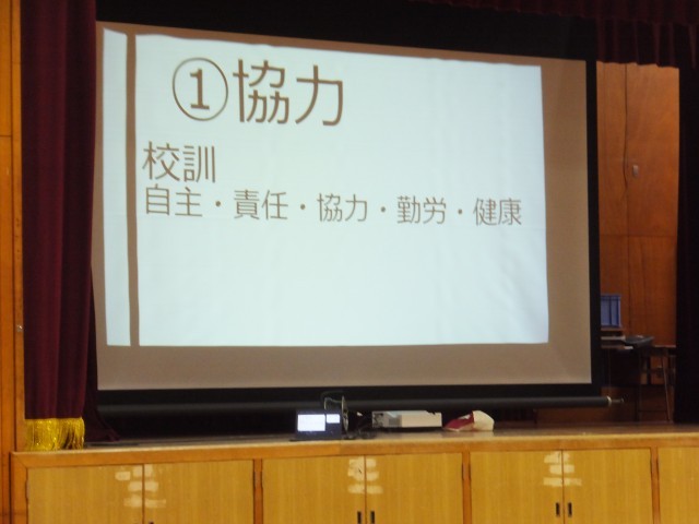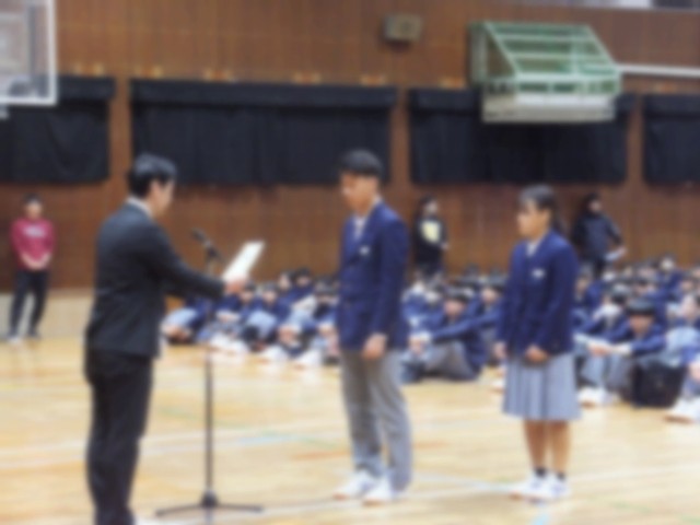 この日の式は、新しく平野中学校に転任された方々の紹介に始まり、春休み中に部活動で活躍をした生徒の表彰、各学年の先生方や職員の紹介、生徒指導主事からのお話、そして、2,3年生と1年生が向かい合い、対面式を実施しました。