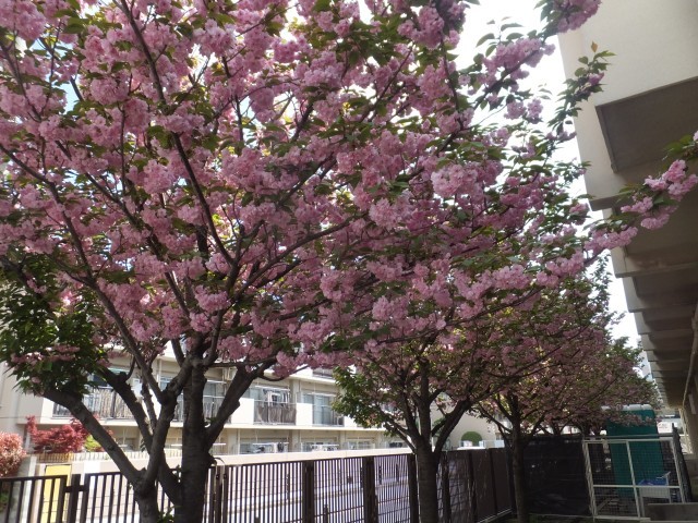また、学級写真を撮影した場所のすぐそばに、八重桜が満開となっていました。ソメイヨシノの季節が終わったあとも、平野中学校の体育館沿いから八重桜が楽しめます。